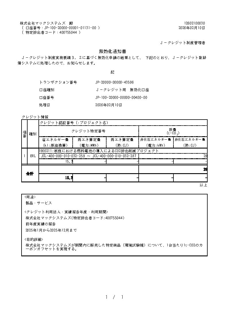 2025年の対象商品の販売実績に従い、29トン分のカーボンオフセットを実行致しました。証拠書類として「無効化通知書」を掲示させていただきます。